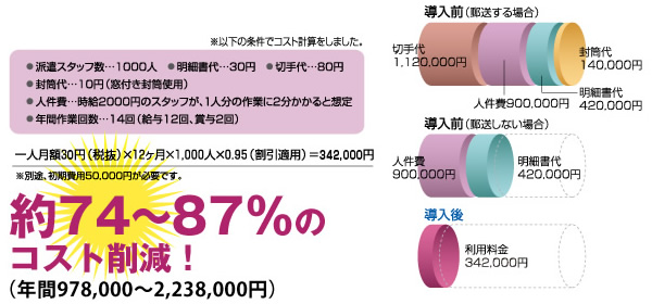 給与明細書代や人件費、毎月の郵送料などの費用を大幅カットできます。